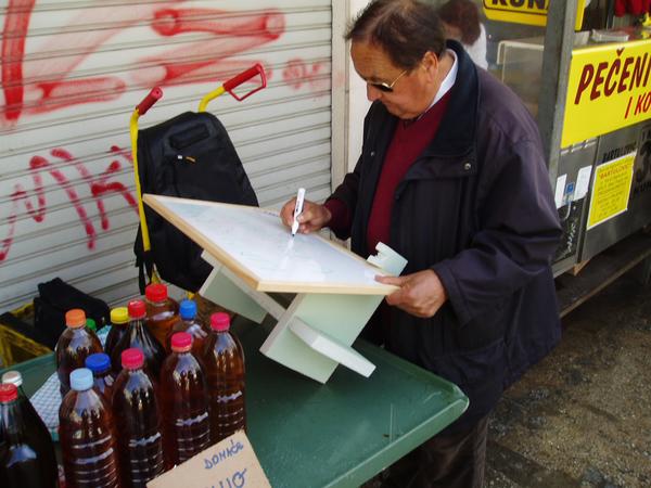A seller from a nearby stall approached us and we gave him our small board. He placed a message on the board at his own stall. This encouraged people even more to approach him to tell stories and to finalize this interaction with a purchase.