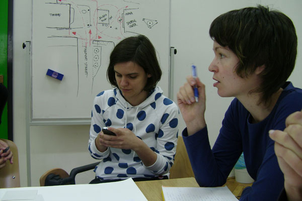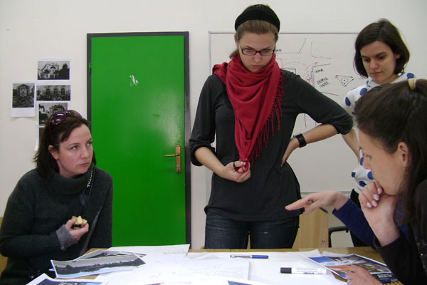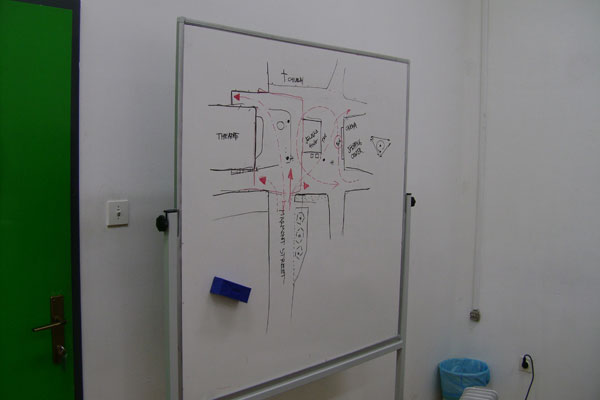 Already on our first visit to the square we noticed the main problems of this place and had some ideas how to resolve those problems. Some of ideas included cultural info point and projection wall. Lately, we made use of sheets with words for brainstorming and we came up to some key words important for our scenario: group of people who needs information that gets digitaly on the transition across the square.
