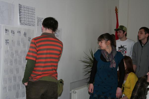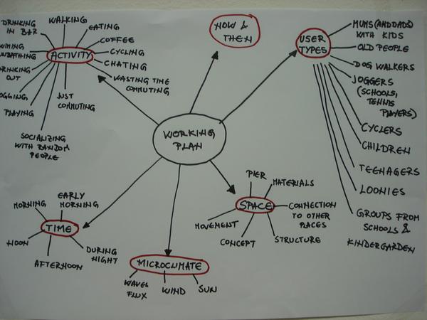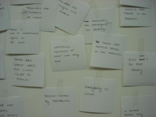 After we came back we tried to write down as many observations as possible, everything that we find out about the beach, and everything that we saw, or heard, or experienced there. We wrote each observation down on its own on small papers and stuck on the wall. Then we separated the most important ones and we came to the conclusion that we have different users (most of the people are frequent, many of them come every day. All of them are locals. Some live in the neighborhood, some drive from different parts of city. There are parents with children, retired people, sportsmen, teenagers...), activities (kids playing in sand, parents chatting on the benches, jogging, teenagers drinking...), interesting atmosphere ( it is an environment for itself. It is cozy, well-organized universe where any interruption is recognized and commented on) and many others.