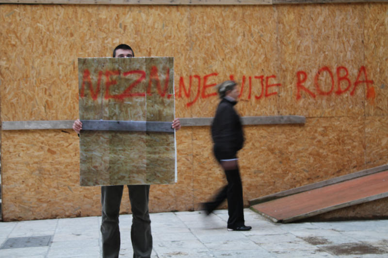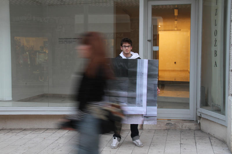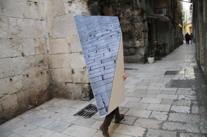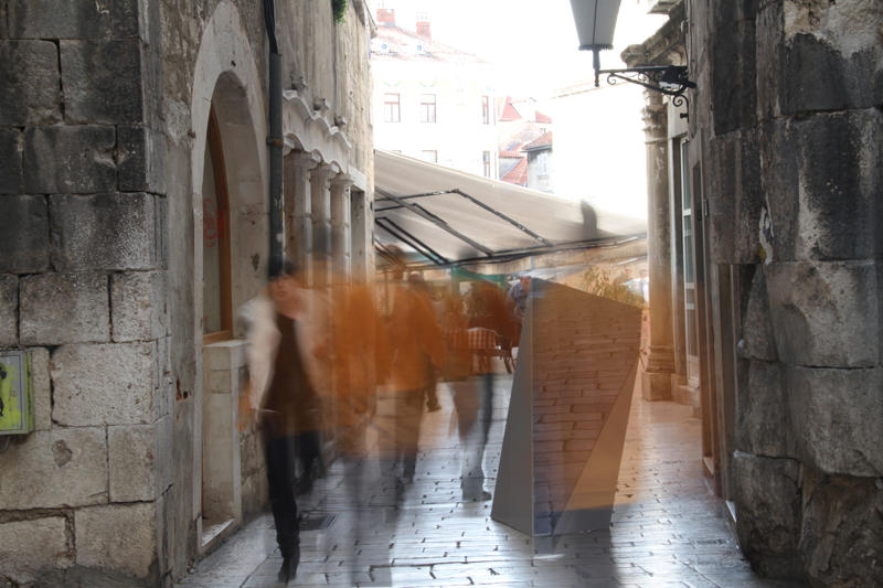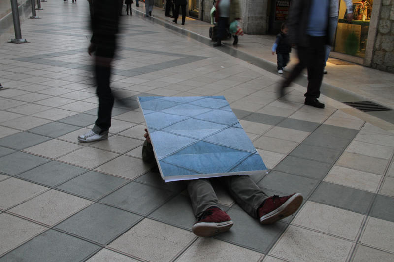 What one does not notice cannot be seen, thus the unnoticeable is what becomes invisible. A town is made up from buildings, houses, objects that hide the private from the public, making people transparent. Streets lead to squares, and every so often one notices people on corners, seeking shelter, meeting somebody, waiting, having a break, hiding away from the open space of the agora. A lost glance can be enough to cause an unwanted encounter and lose sight of what wants to be seen. Behind the corner is always unknown.