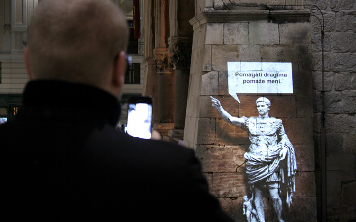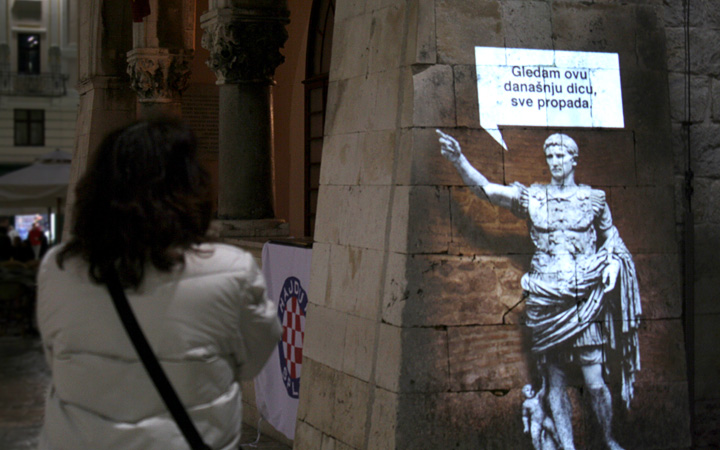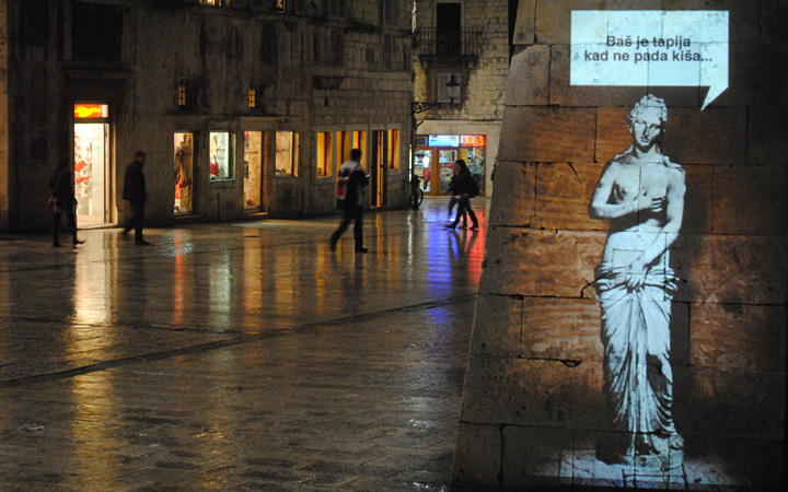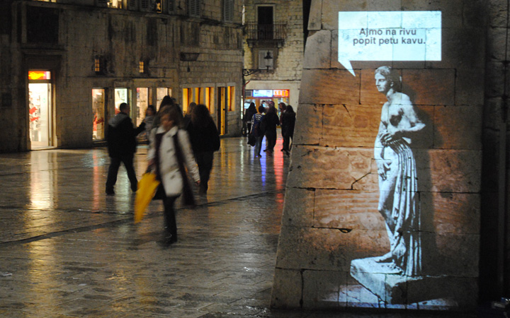 Historical figures, synonymous with Split, for example Dioklecian, Ivan Mestrovic & Siegmund Freud were used to give a voice to the issues and concerns of the current generation of inhabitants of the city. These figures represent the city spirits who will, by projection on to the walls of the city, "tell" people how they feel about city today and so act as a catalyst for thought. By projecting sculptures and messages, the idea was to make people stop, look, read and re-think.