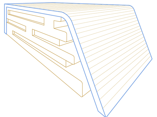 The roof of the building is imagined as a large shell or shield, with its whole area covered with blue solar panels and thermal collectors. The uncovered side of the building is the least exposed to the sun, and on that side there are terraces and paths.